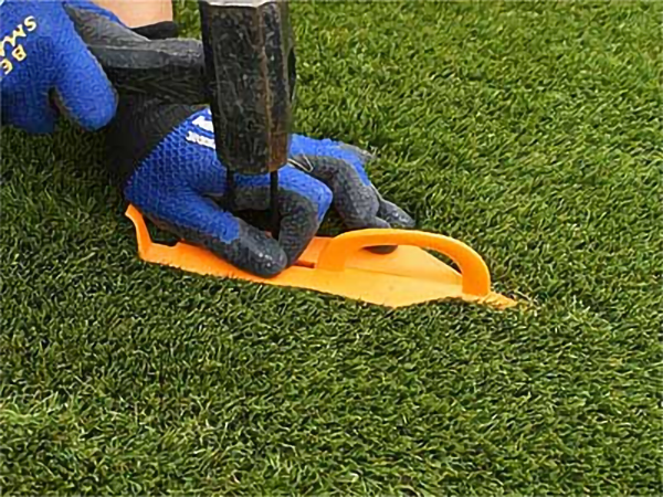 そこで、このパイルスプリッター®の出番です。人工芝にするっと差し込むだけで、芝をかき分けてピンを打つ面を出してくれます。