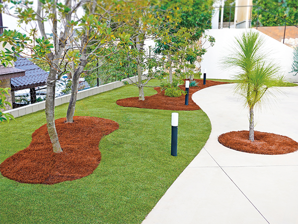 画像のようにカーブの施工で庭にやわらかさを出したり、植栽の根元にアクセントを設けたり(画像はマスターズバークを使用)、デザイン性の高い施工ができます。同じ人工芝を使っても、ちょっとした工夫で庭の印象がガラリと変わりますね。