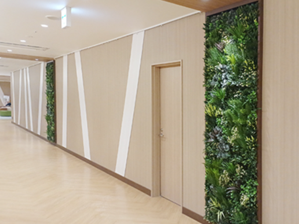 ビスタフォリア®による厚みを抑えた壁面緑化で、動線にそって心地よく風が通り抜ける空間になっています。