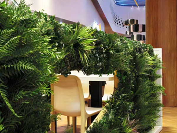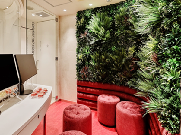 ビスタフォリア®は天然植物に比べ厚みが少なく、通路・屋内でも風の流れを妨げにくい壁面緑化パネルです。